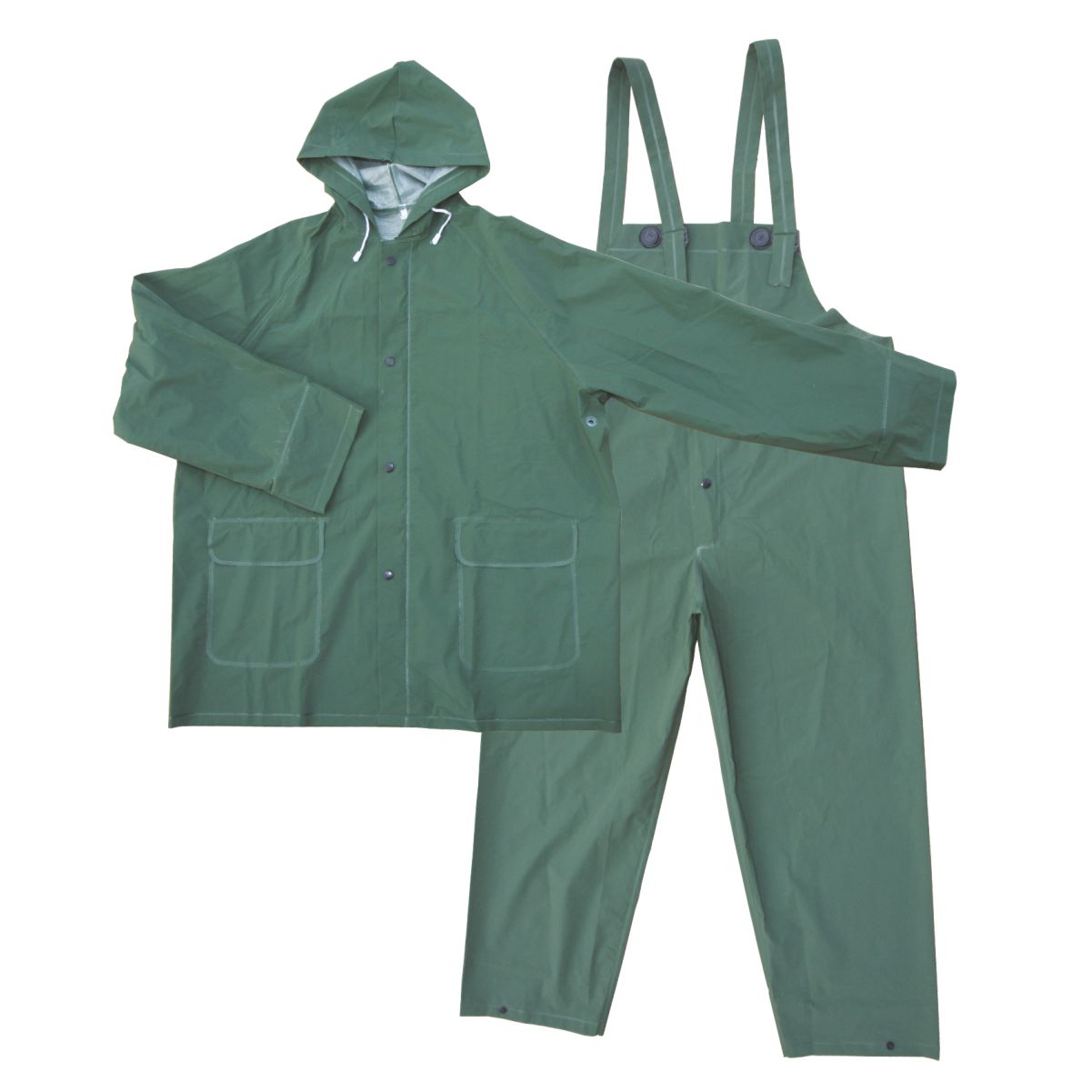 Prevăzut cu glugă / Închidere cu capse și fermoar / Elastic la mâneci / Lipire termică / Dublură pe spate / Buzunare în față / Format din pantalon cu bretele și jachetă.