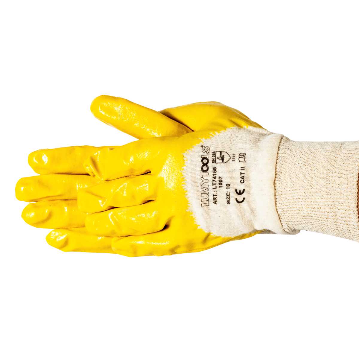 Mănușile de protecție LT74155 cu captușeală interlock (material tricotat dens), acoperite pe jumătate cu nitril și manșetă tricotată.